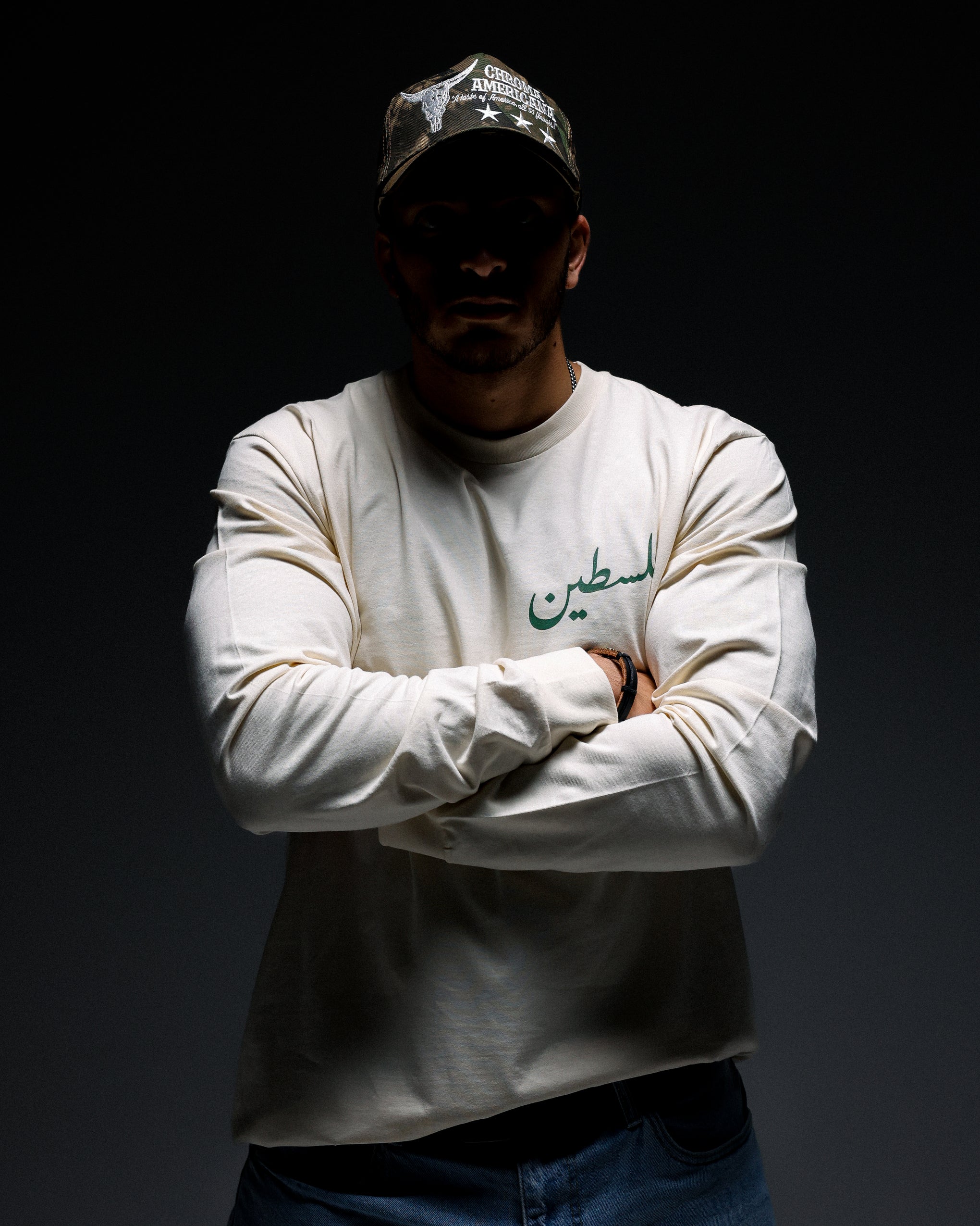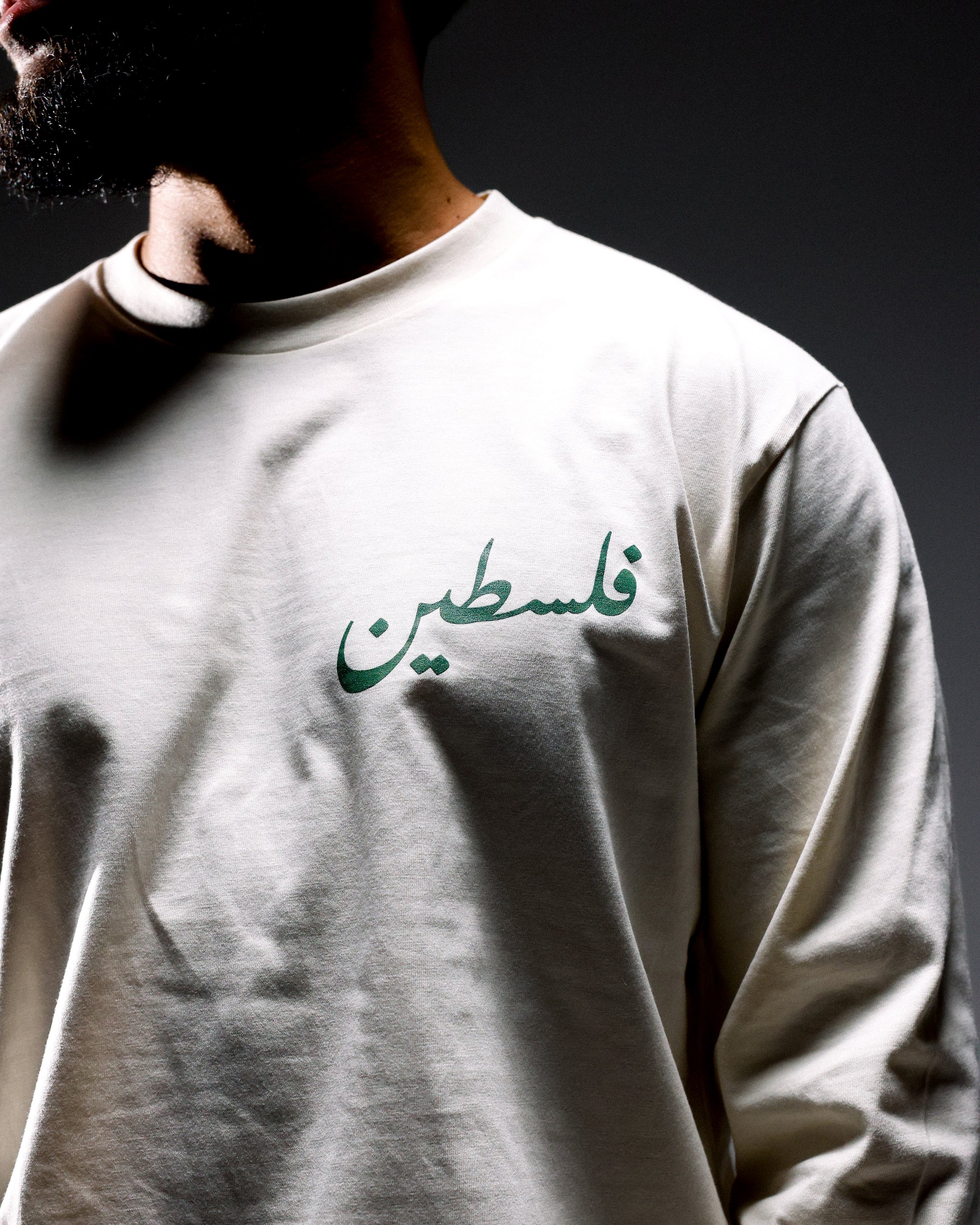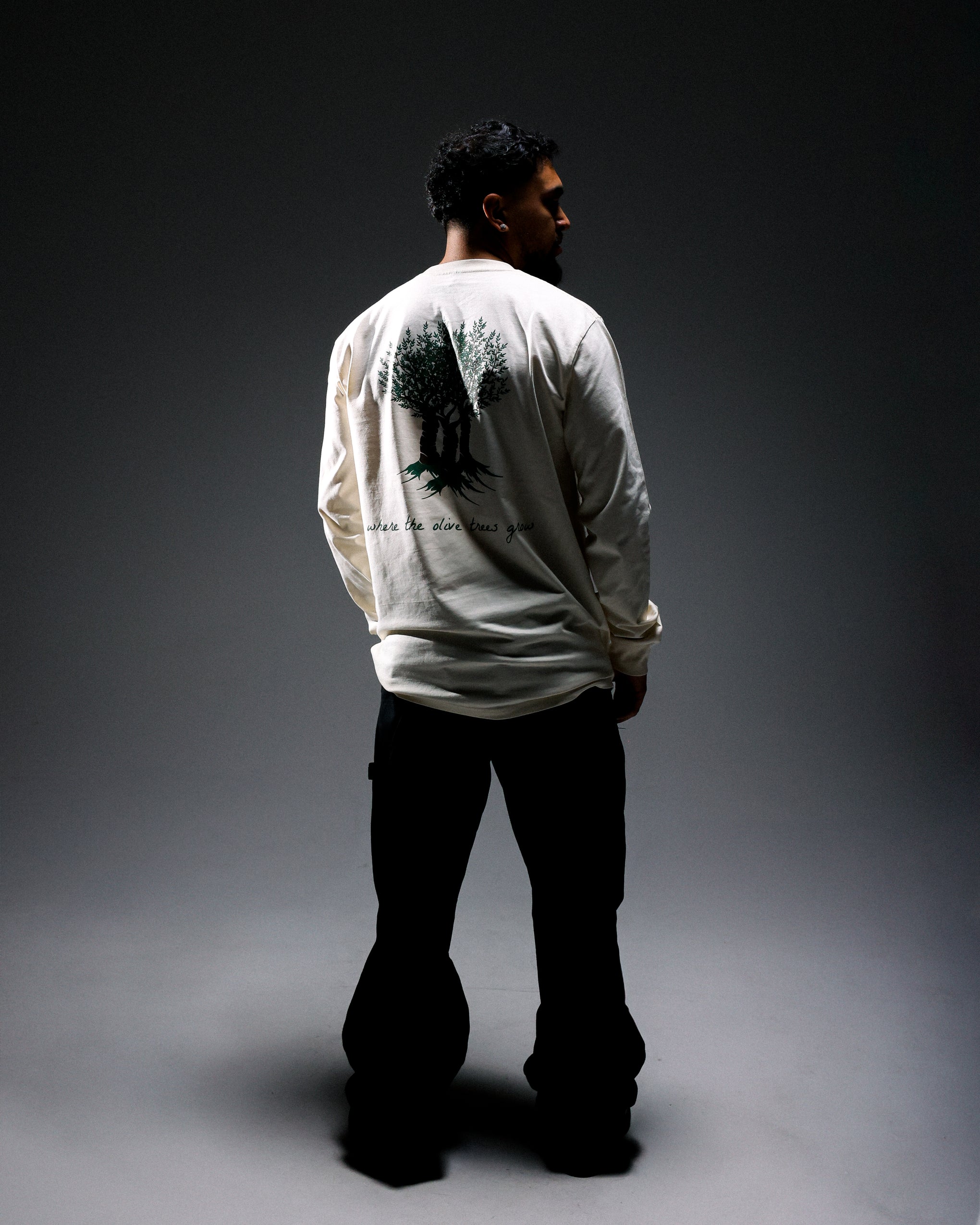A nod to Palestinian identity and resilience, it blends culture with style. The olive tree, symbolizing strength, peace, and deep-rooted heritage, adds a meaningful touch, making the piece not just fashion, but a tribute to heritage and resistance. The design brings together bold graphics and powerful messaging, perfect for those who wear their beliefs on their sleeve.